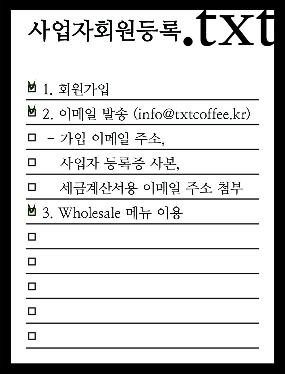 계좌_국민은행-이수환(티엑스티)-81723704006280 개인정보책임관리자_티엑스티(info@txtcoffee.kr) Copyright 티엑스티 All rights reserved Hosting by (주)아임웹